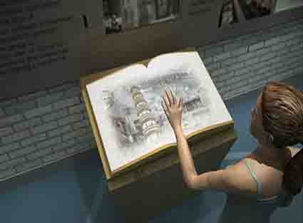 虛擬電子書猶如一本打開的書籍,里面記載的豐富資料可通過參觀者揮動手臂“翻閱”書籍,如同平常翻閱書籍,快速找到您想翻閱的內容。
