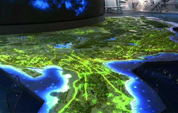 全息投影沙盤是一種常見的沙盤展示形式,晟跡全息投影沙盤是一種結合了全息投影技術和數字沙盤技術的展現形式,即由投影機投影計算機生成的3D動畫。在實體沙盤模型上,將3D動畫和模型合并在一起,可以實現令人驚嘆的視覺效果。